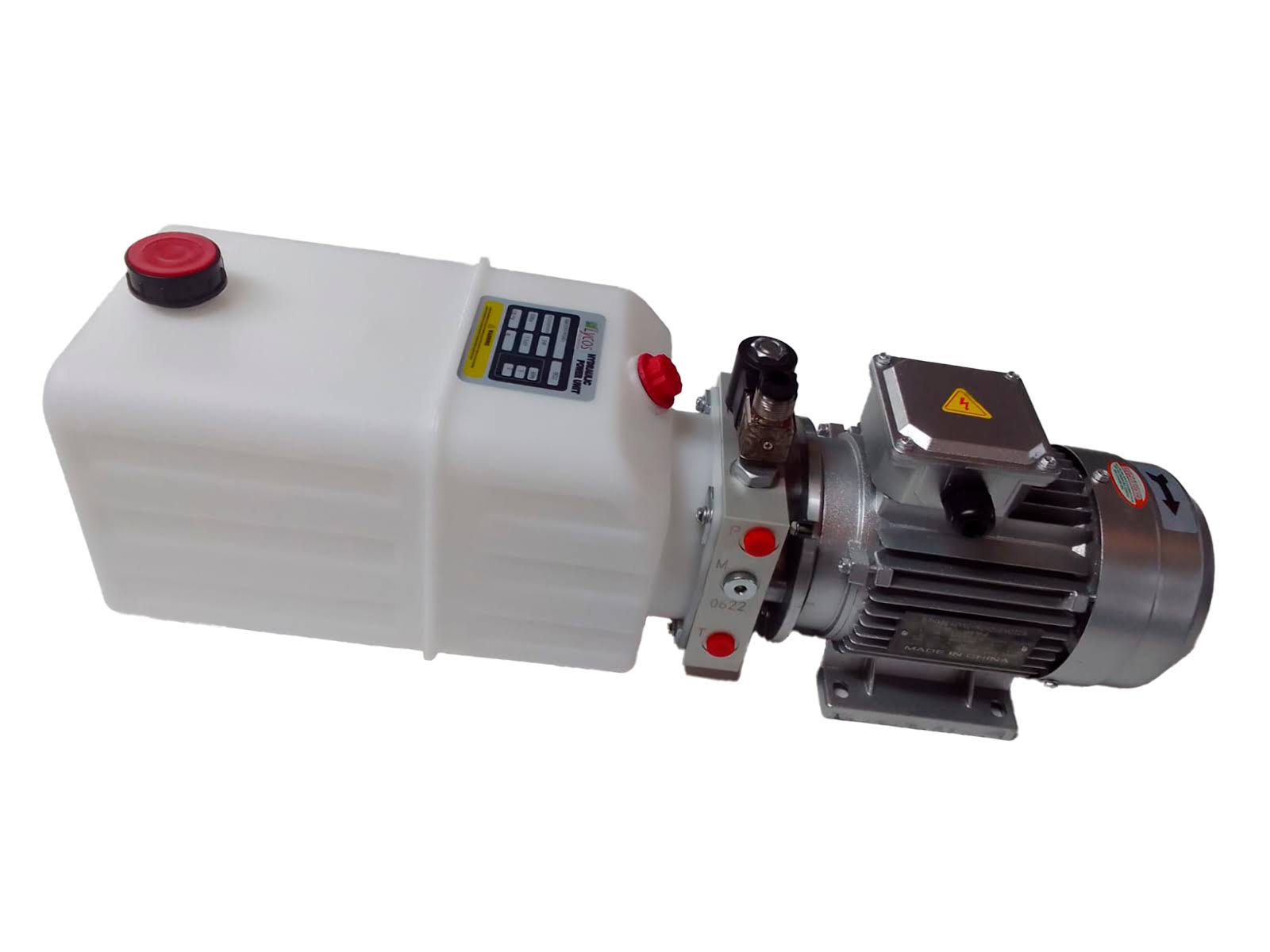 Especificações: Mini central hidráulica de simples ação com motor de 1CV trifásico de 2 polos, reservatório de 4 L em poly, vazão 3,45 LPM, pressão até 100 bar, bobina 24v